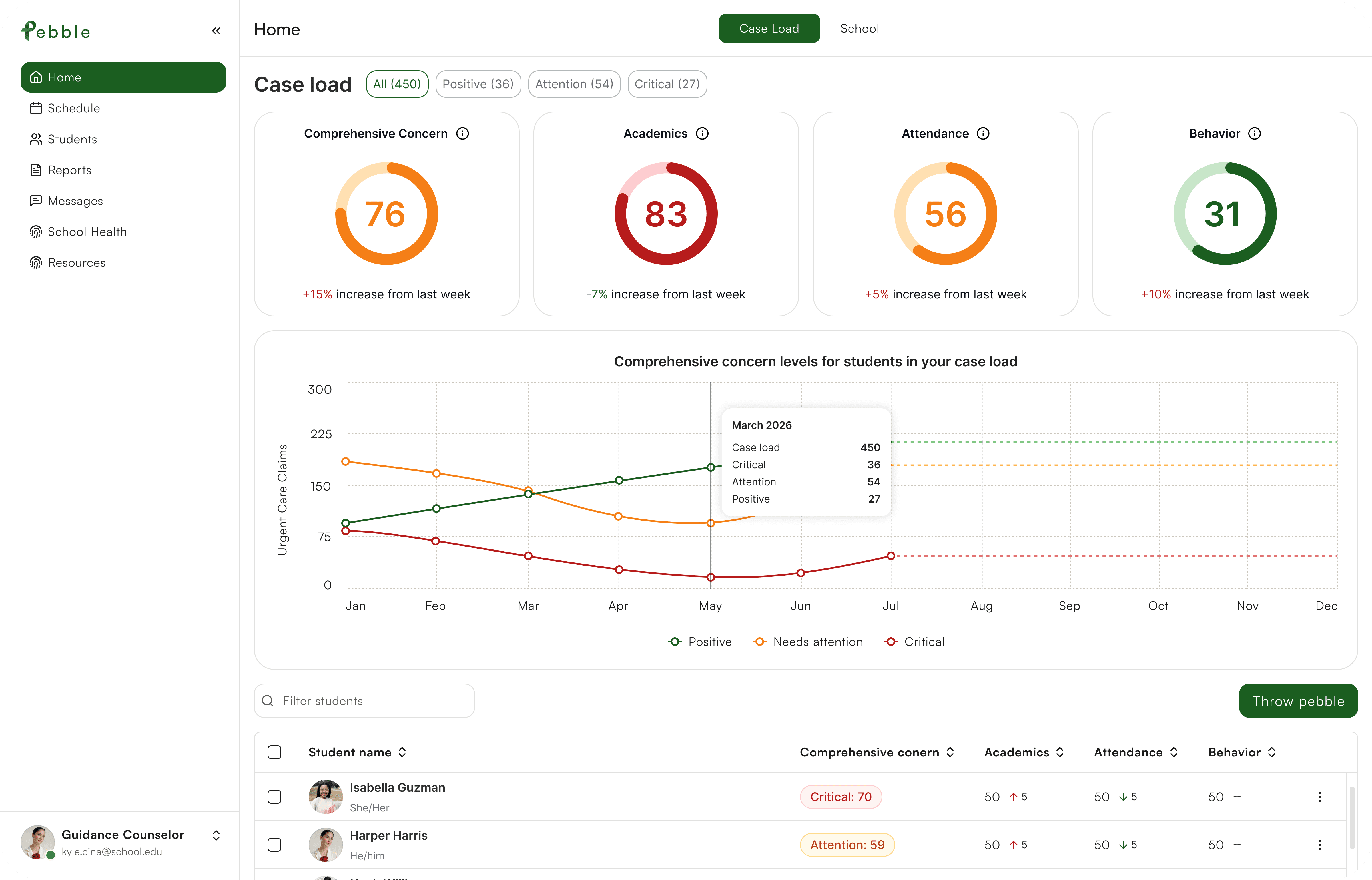 Built by counselors and educators, Pebble is designed to reduce administrative overload, surface what matters most, and help student support teams respond with clarity, speed, and care.